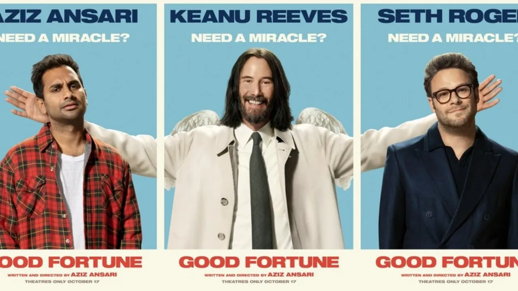 Heed your torches and pitchforks, my loyal followers.  I know October is a time for jack-o’-lanterns, ghouls, and scary movies, but I couldn’t pass up the opportunity to see the comedy Good Fortune.  A film revolving around Gabriel, an angel played by Keanu Reeves, who is a bit unhappy in his role as an angel who prevents texting-and-driving accidents.  Hoping to prove himself to his superiors, he gives Arj, a down-on-his-luck gig worker played by Aziz Ansari, an opportunity to trade lives with his ex-boss Jeff, played by Seth Rogan, so Arj can learn that money doesn’t always solve your problems.  Unfortunately for Gabriel, Arj learns that even though money didn’t help him with his relationships, it did relieve him of the stressful life of a gig worker and is unwilling to trade places with Jeff.  Gabriel is immediately demoted from an angel to a human, and chaos ensues.